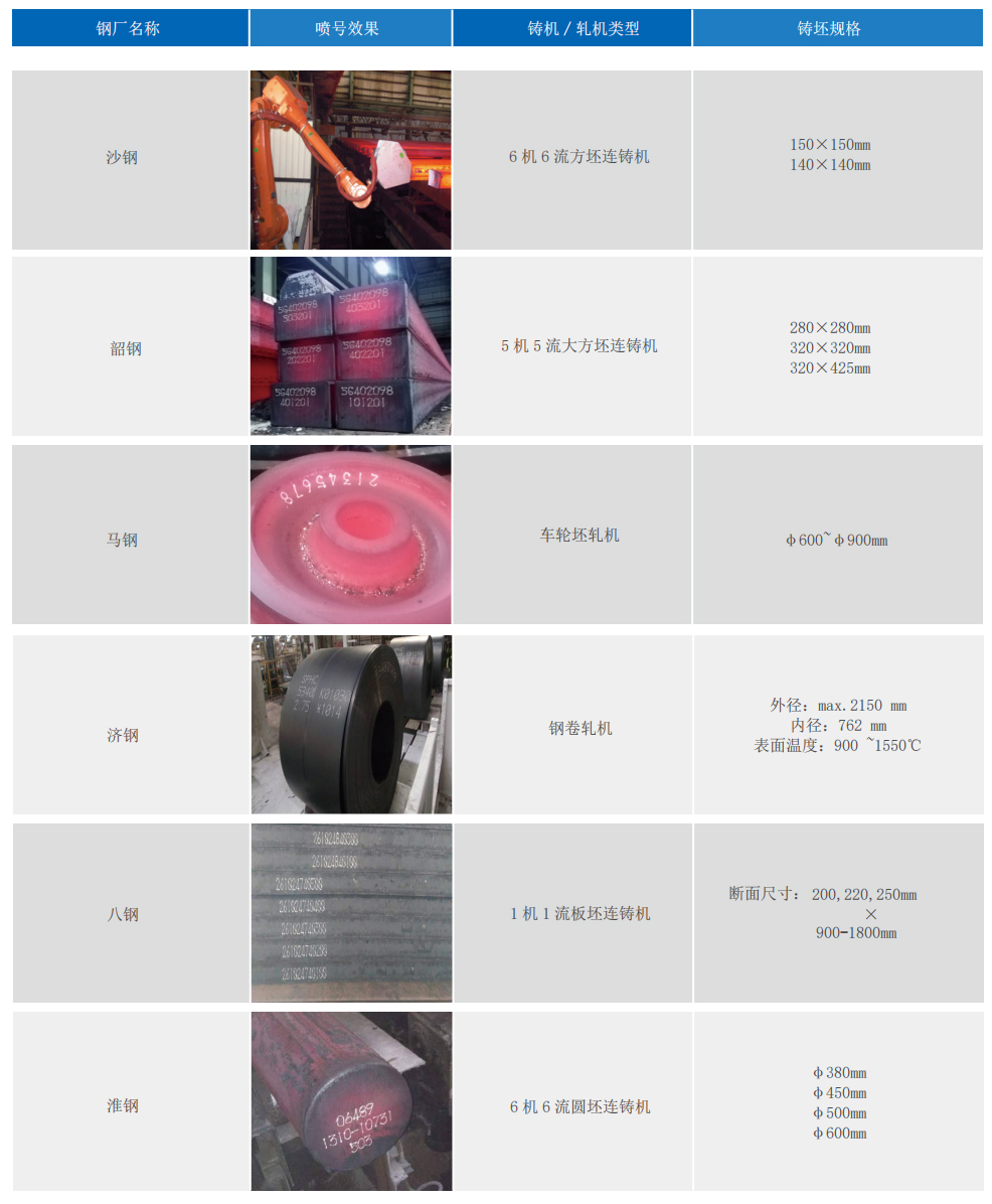 沙鋼、韶鋼、馬鋼、濟(jì)鋼、八鋼、淮鋼、大冶特鋼、寶鋼特鋼、華菱湘鋼、西王特鋼、酒鋼、蕪湖新興鑄管、永鋼、通化鋼鐵、濰坊鋼鐵、石家莊鋼鐵、萊鋼永峰、河北津西鋼鐵、河北敬業(yè)鋼鐵、印度 Vizag 等。
